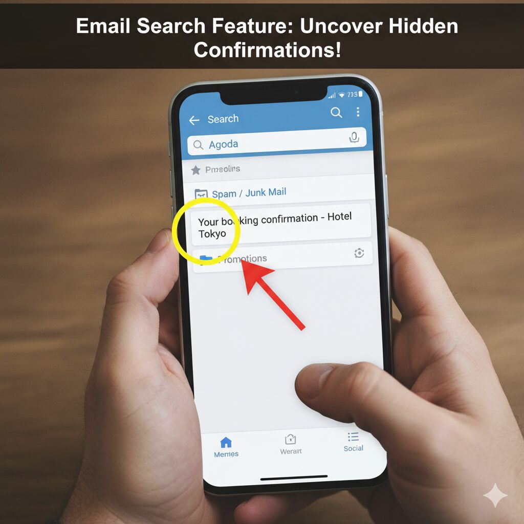 (Image: A person’s hands holding a smartphone, displaying an email application interface. The search bar at the top shows “Agoda” typed in. Below the search bar, potential email results are shown, including “Spam / Junk Mail” and “Promotions” folders. A specific email titled “Your booking confirmation – Hotel Tokyo” is highlighted, indicating it might be hidden in one of these folders. A red arrow points towards this highlighted email, emphasizing its importance. The overall design mimics a common email app UI, making it relatable for users searching for their Agoda confirmation.)