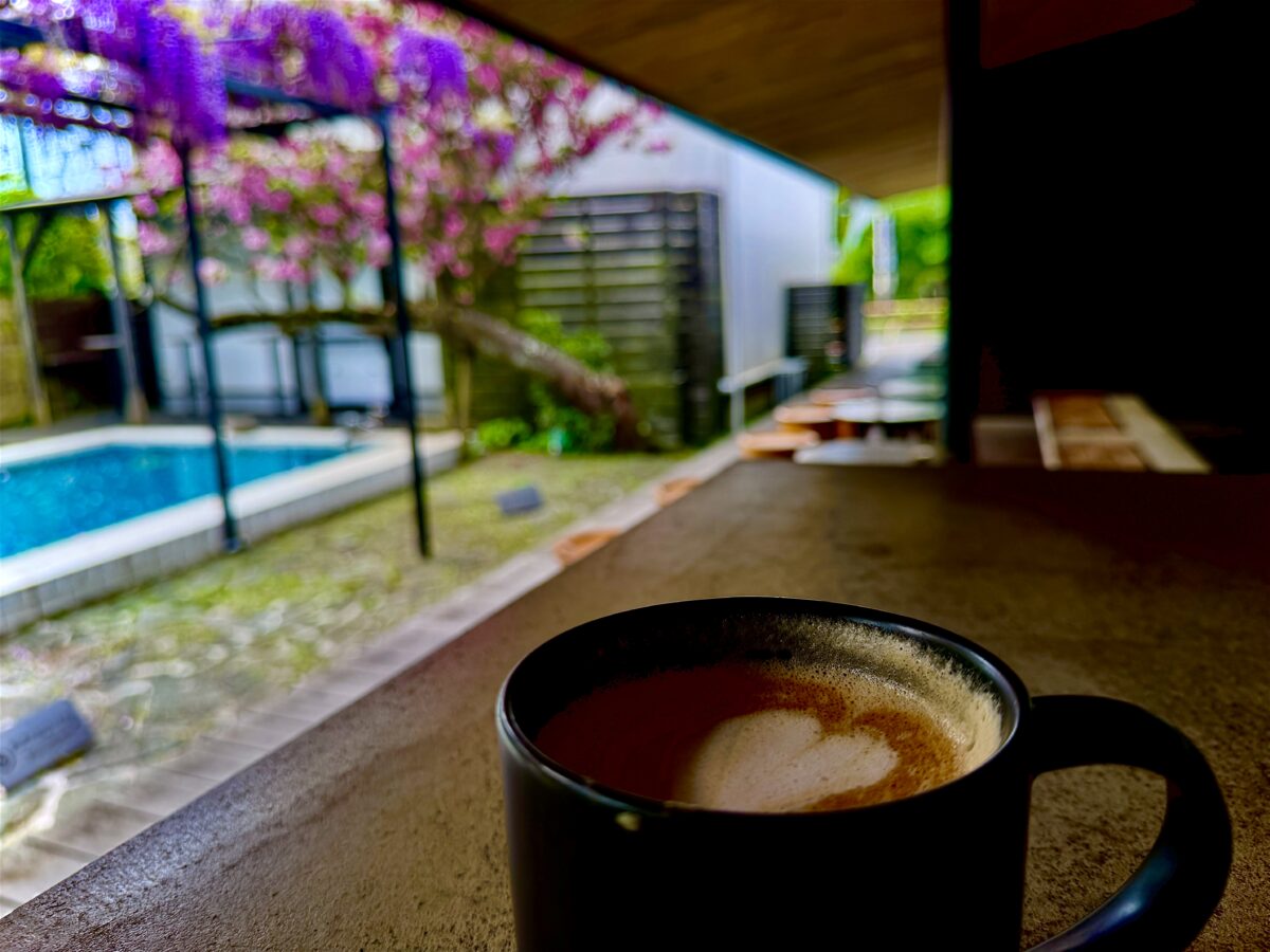 もしあなたが執筆や読書に没入したい・・・もしくは、ぼーっとしてゆっくりしたいなら、プールから一番近い手前のベンチ席を選んでください。視界を遮るものが何もなく、藤の香りがダイレクトに届きます。ここではスマホを置き、ただ花と対話する。そんな贅沢な時間が、鎌倉には流れています。