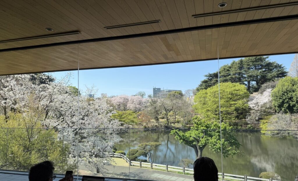 新宿御苑スターバックス テーブル席から見える芝生と桜も絶景